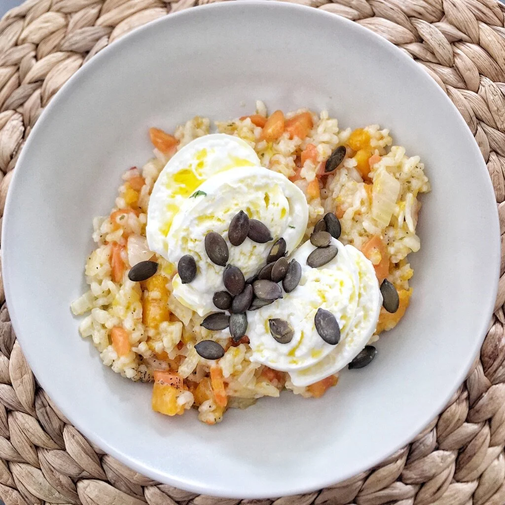 Ôtez du feu après 2-3 minutes et ajoutez le parmesan râpé ainsi que la boisson végétale et mélangez bien. Rectifiez l’assaisonnement en sel et poivre.